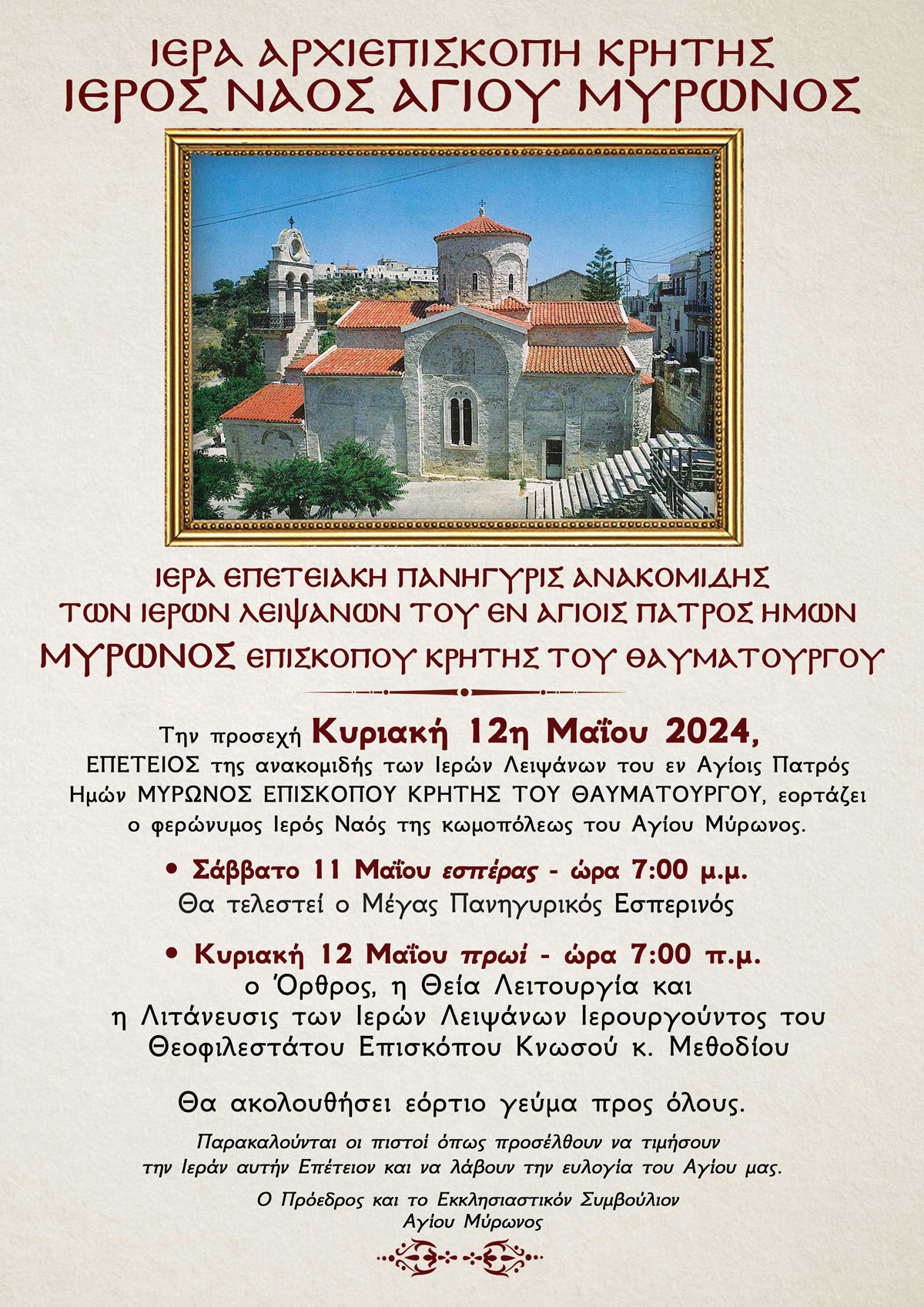 Πρόγραμμα πανηγύρεως Αγίου Μύρωνος Ηρακλείου επί τη ανακομιδή των Ιερών Λειψάνων του 2024